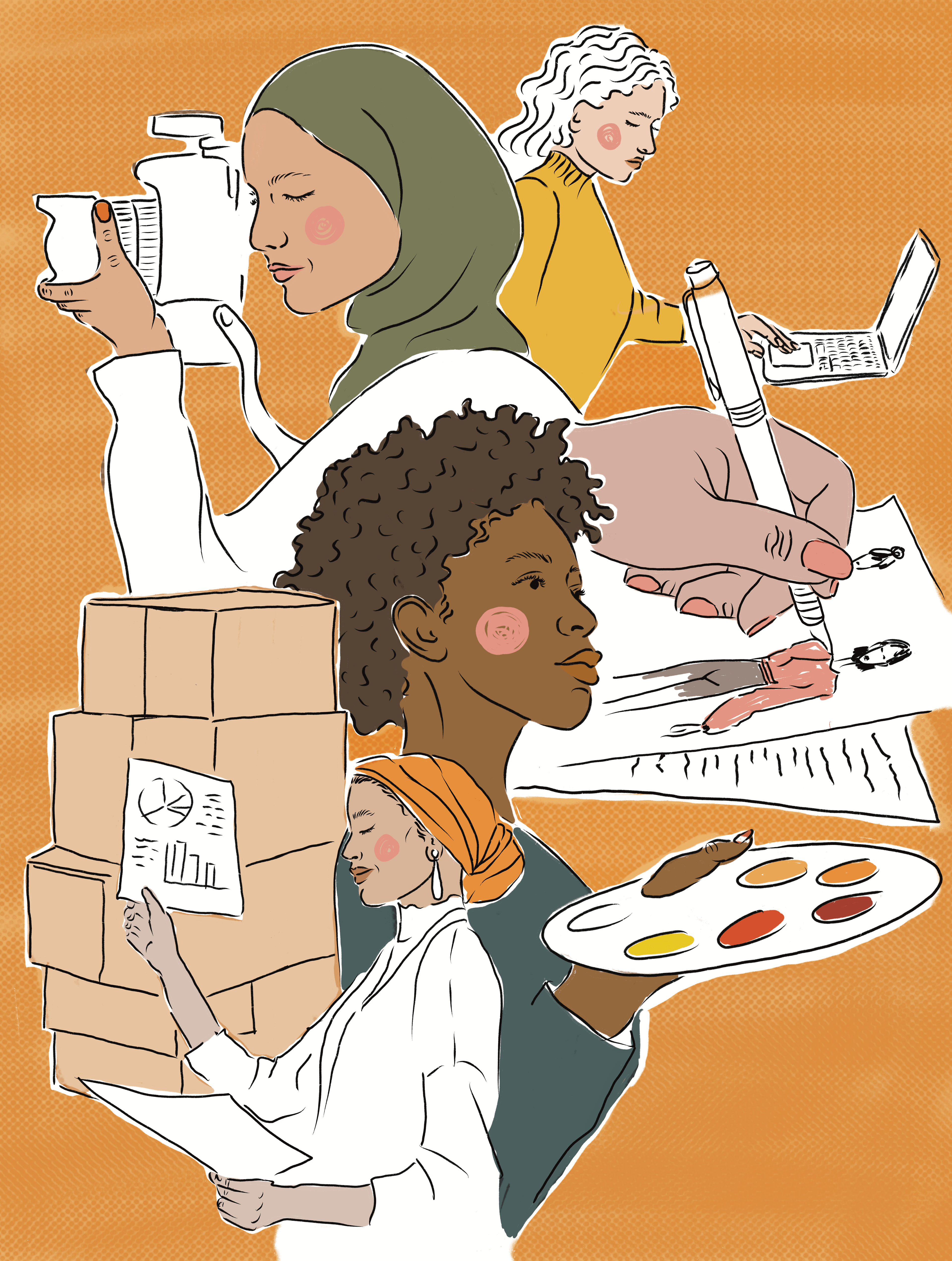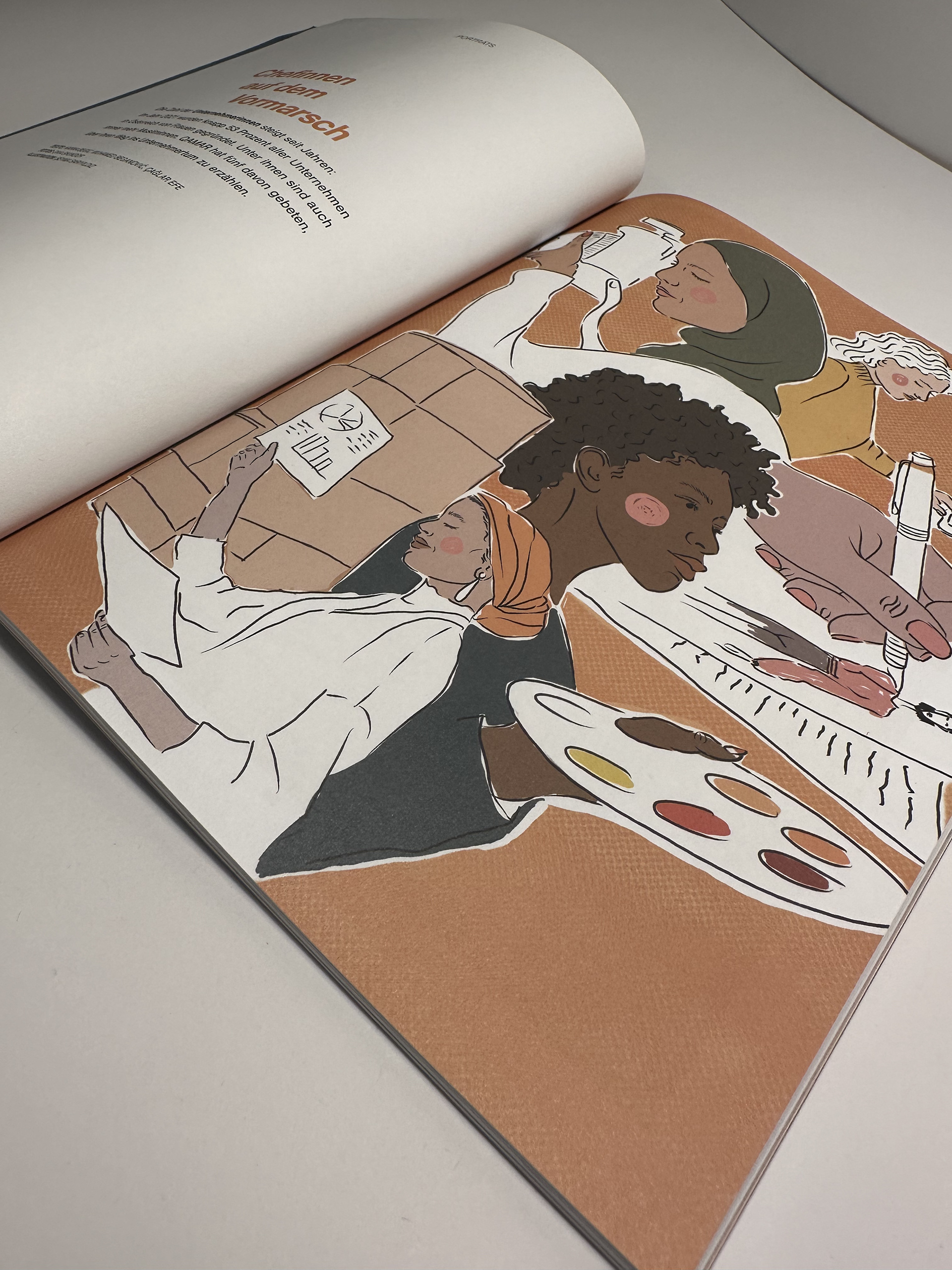 for the 6th edition of QAMAR magazine I illustrated a page for the text ´female bosses on the rise´ by Hanna Bergić, Muhammed Beganović and Çaǧlar Efe with portraits of female entrepreneurs and their work.